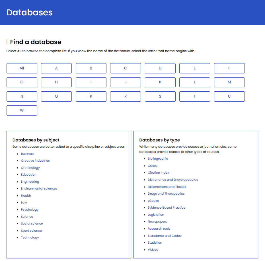 Go to the library website and select the Databases link. Databases are listed by title, subject and type.