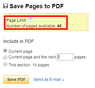 The Save Pages appears at the top of the online reader. Clicking on the icon will display what is allowed to be saved as a PDF. It highlights: