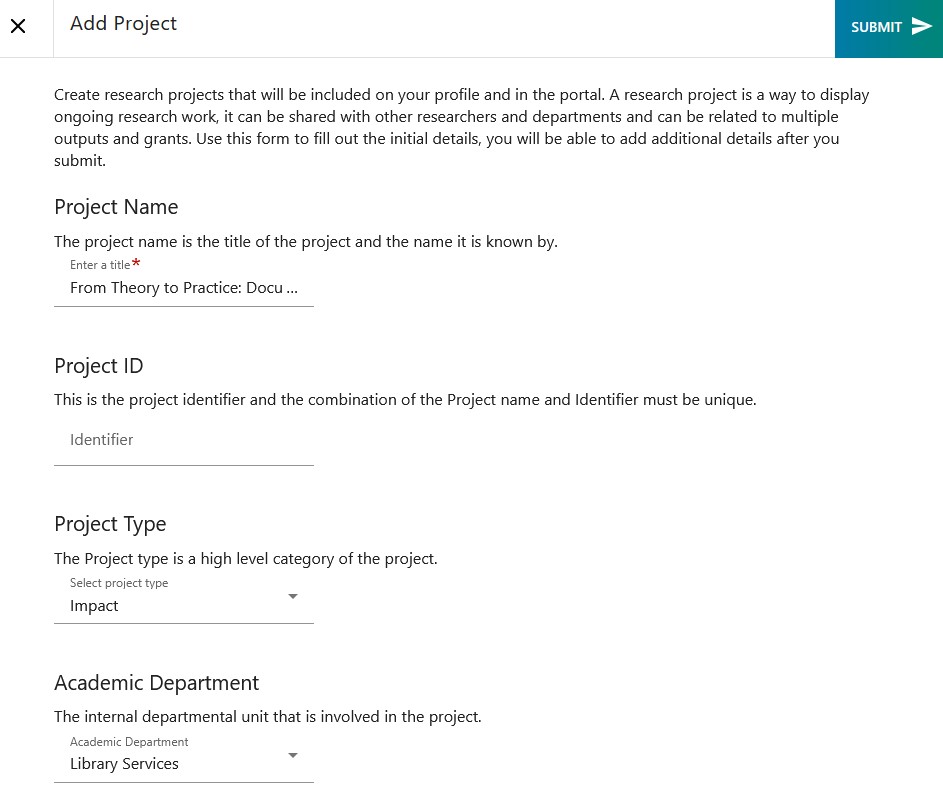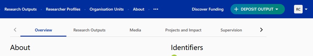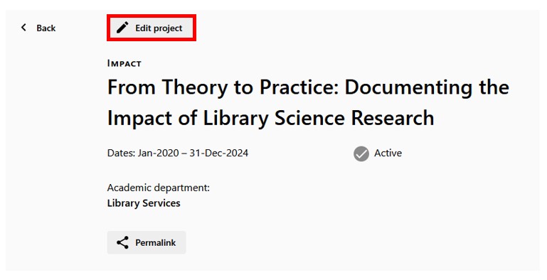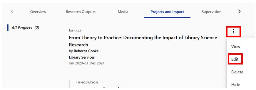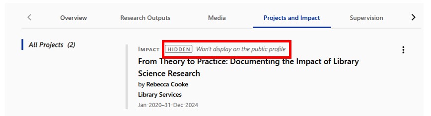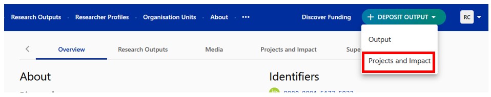 From your researcher profile in Research Bank (when signed in), go to the Projects and Impact tab.