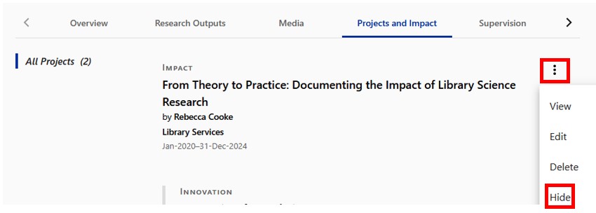 If you would like to hide an impact record for your profile, click the three ellipses next to the record you wish to hide, and select Hide from the drop down menu.