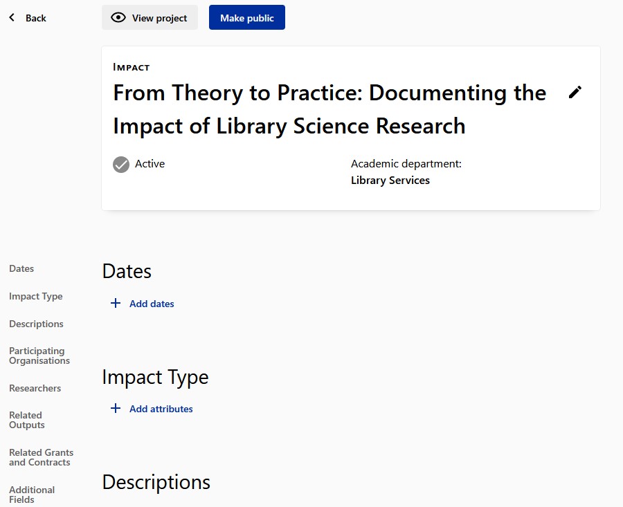 If you are happy with the content and have reviewed it, you can make the impact record public by clicking the Make public button. Once the record has been made public, it will show up on the researcher profile for all associated researchers.