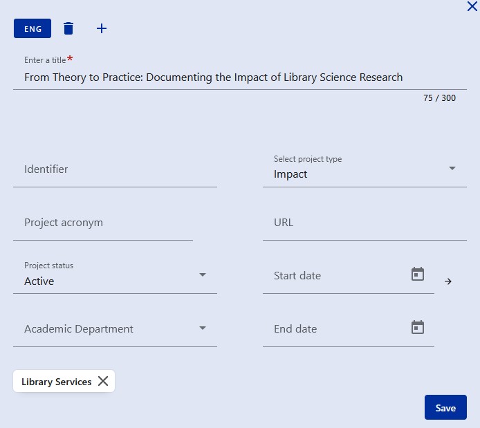 | Project name (mandatory) | Enter a short title for the impact record. The title is limited to 300 characters. |