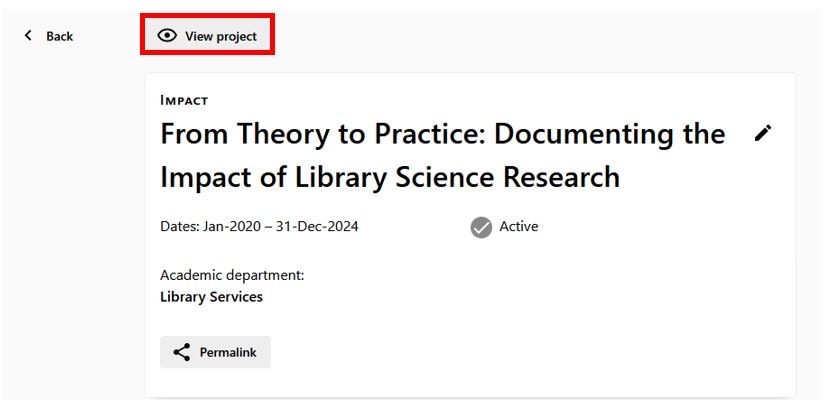 When you have completed the project record, scroll to the top of the page and click View project to see how the impact record will look to the public.