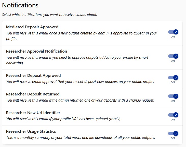You can select which notifications you do not wish to receive from Research Bank. By default, all notifications are active.